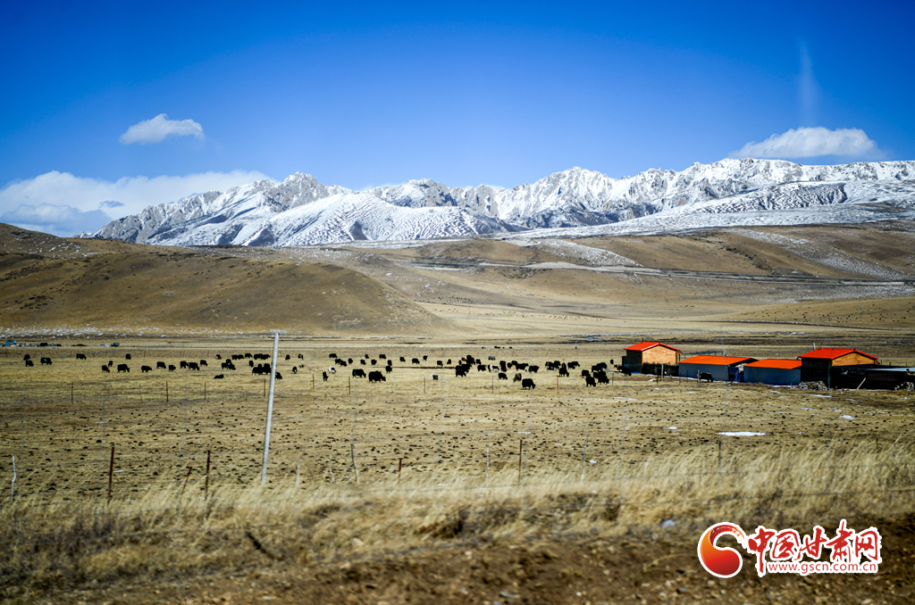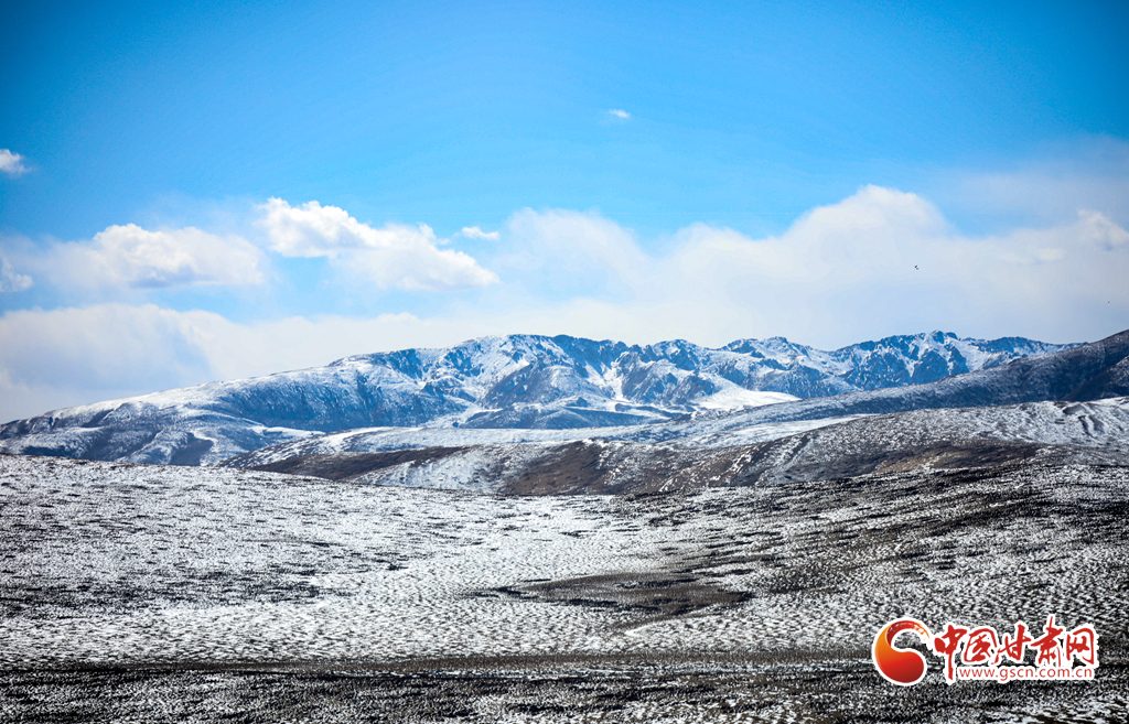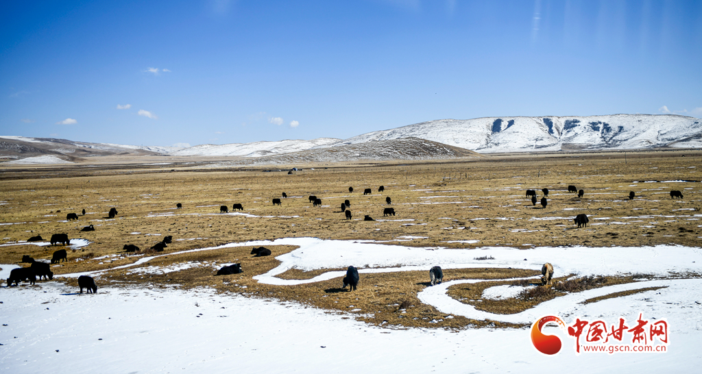 3月8日,甘肃省甘南藏族自治州碌曲县境内再次出现降雪天气,雪后初霁,大地银装素裹,山间云雾缭绕,牛羊成群结队在雪原中奔跑、觅食,构成一幅和谐的生态画卷。