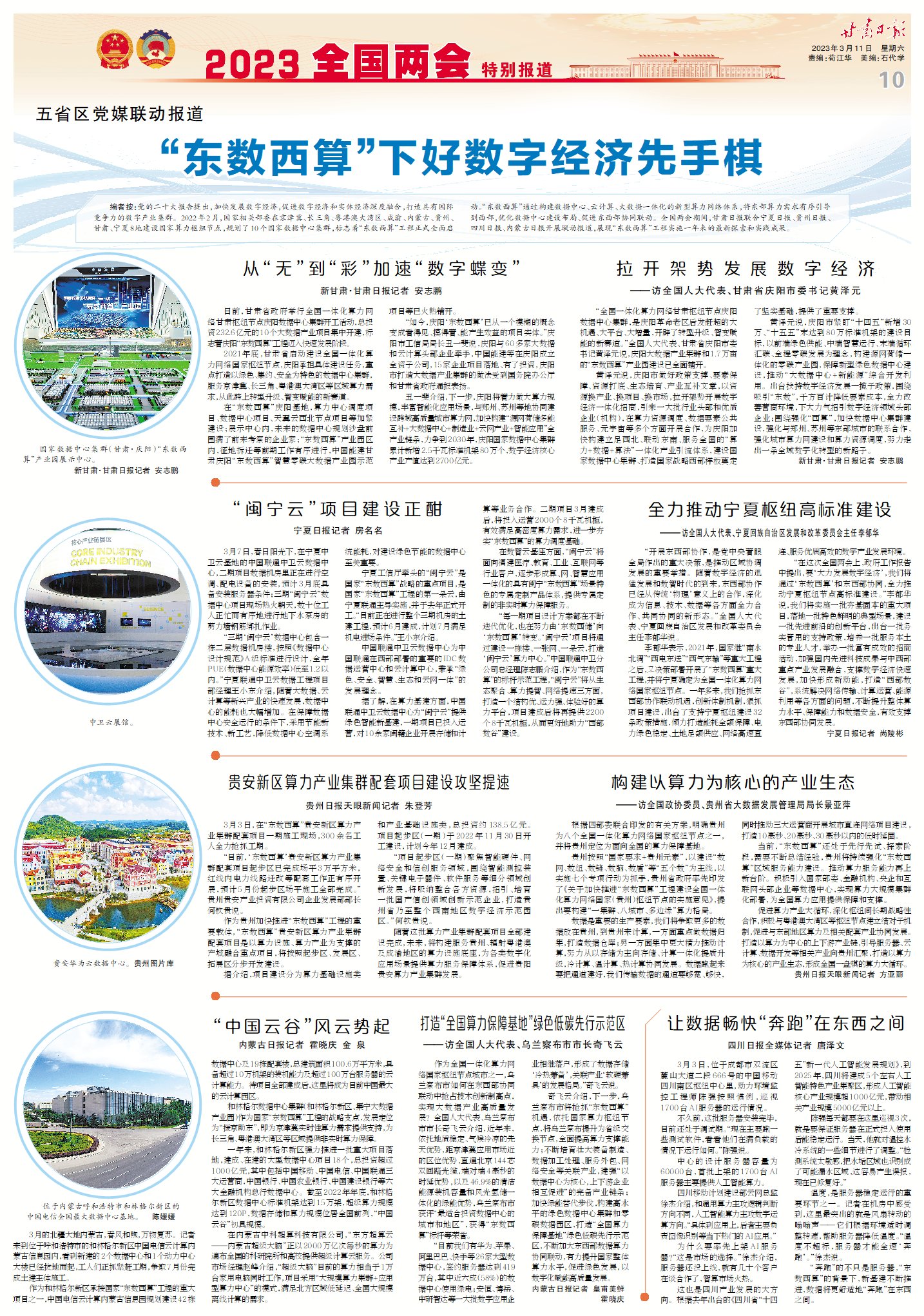 编者按:党的二十大报告提出,加快发展数字经济,促进数字经济和实体经济深度融合,打造具有国际竞争力的数字产业集群。2022年2月,国家相关部委在京津冀、长三角、粤港澳大湾区、成渝、内蒙古、贵州、甘肃、宁夏8地建设国家算力枢纽节点,规划了10个国家数据中心集群,标志着“东数西算”工程正式全面启动。“东数西算”通过构建数据中心、云计算、大数据一体化的新型算力网络体系,将东部算力需求有序引导到西部,优化数据中心建设布局、促进东西部协同联动。全国两会期间,甘肃日报联合宁夏日报、贵州日报、四川日报、内蒙古日报开展联动报道,展现“东数西算”工程实施一年来的最新探索和实践成果。