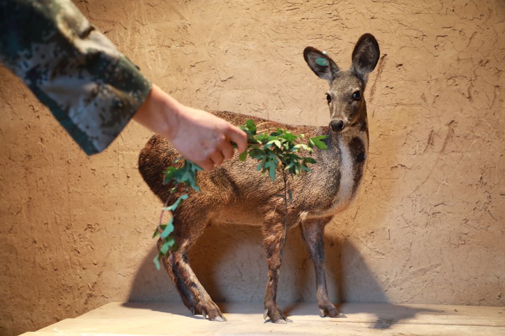 饲养员喂养林麝。新华记者梁军 摄