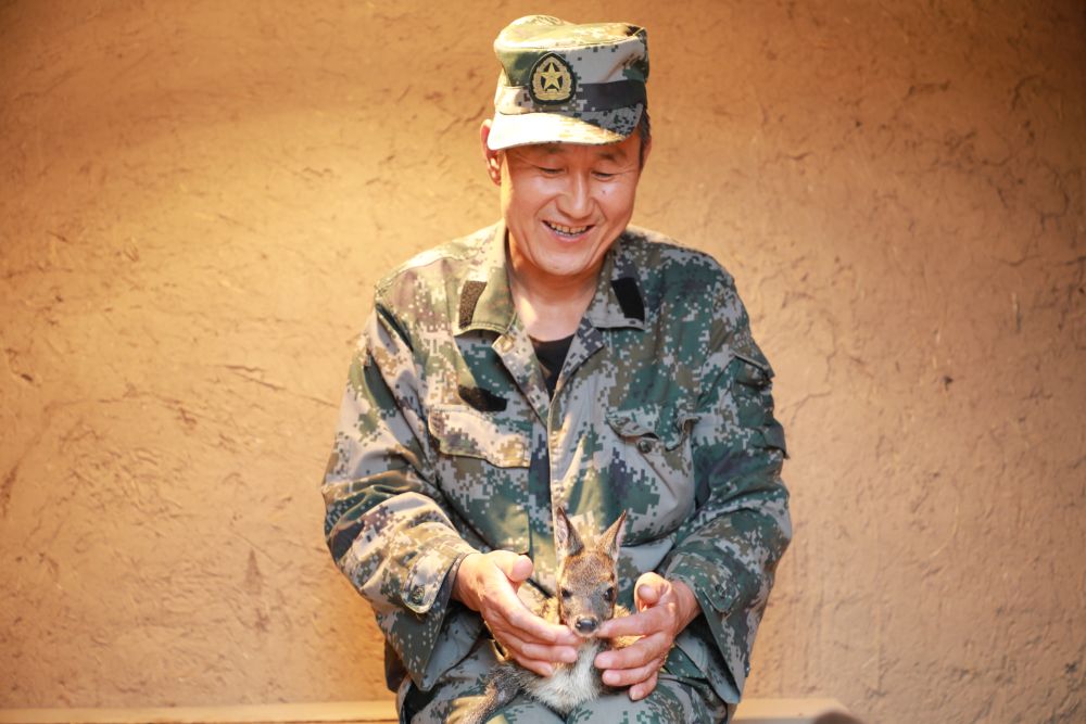 饲养员与一只年幼林麝。新华社记者梁军 摄