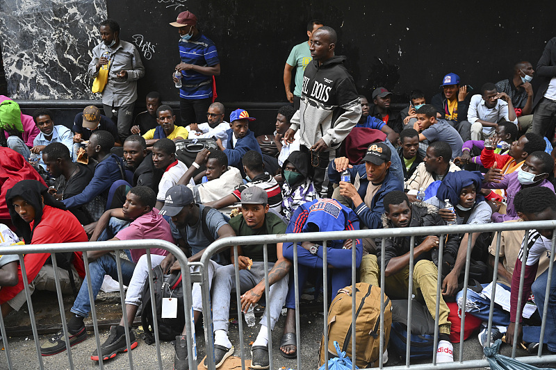 当地时间8月1日,纽约市罗斯福酒店门前再次挤满了寻求庇护的非法移民。而类似景象在如今的美国早已司空见惯。