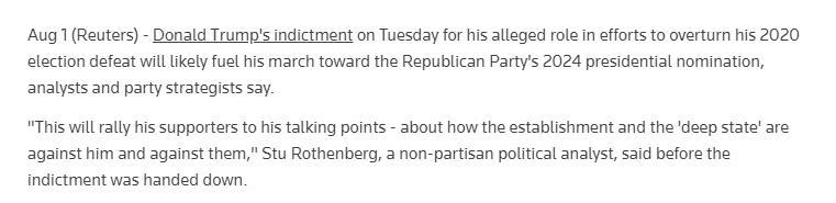 路透社:共和党大选战略分析师认为,特朗普受到刑事指控反而会“助推”其选情。