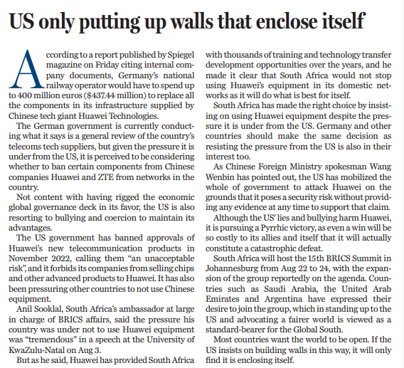 面对来自美国的压力,南非坚持使用华为的设备,这是正确的选择。德国和其他国家应该做出同样明智的决定,抵制来自美国的压力,因为这才符合其本国的利益。