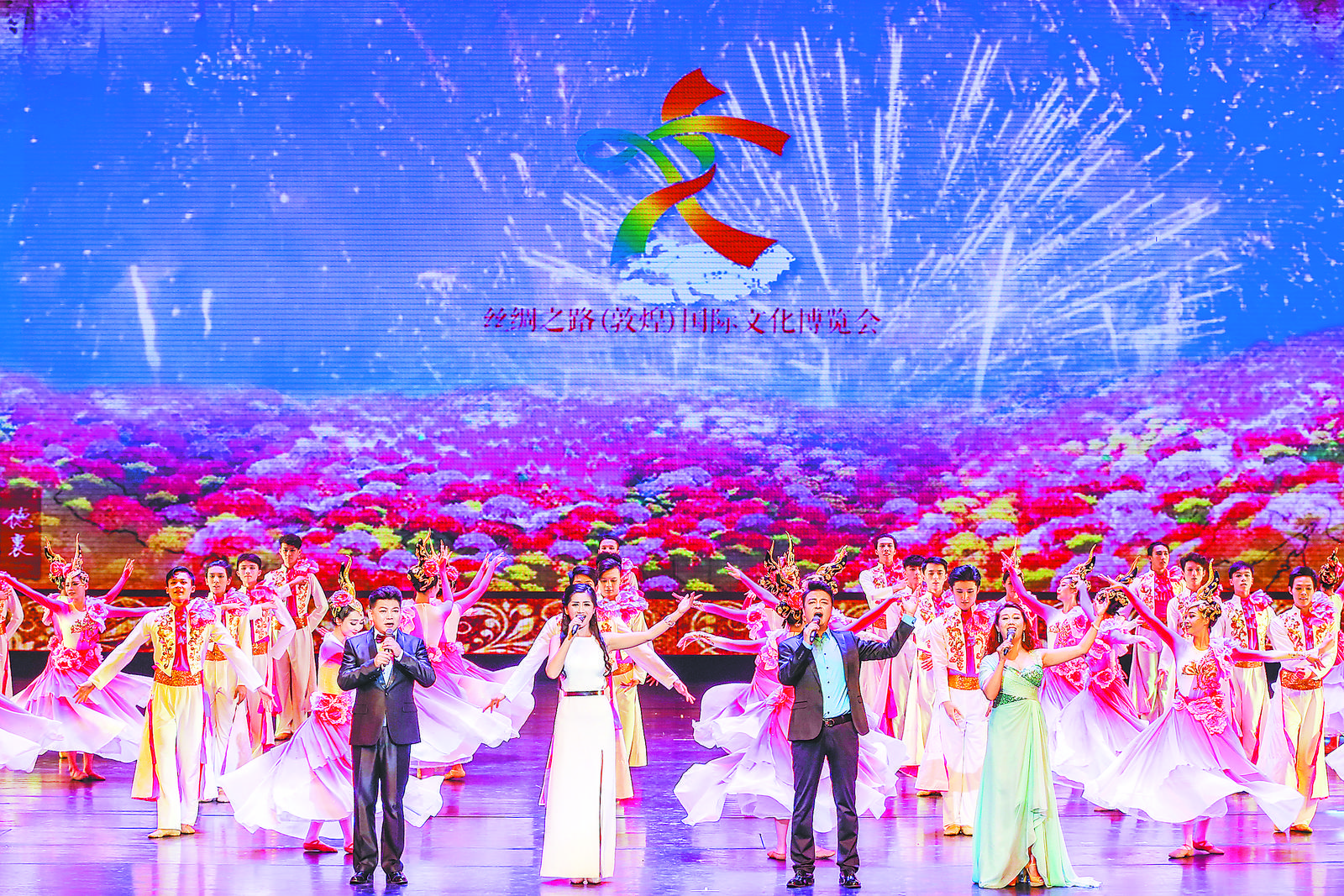 丝绸之路(敦煌)国际文化博览会(以下简称“敦煌文博会”)已成功举办了五届,每一届的中外联袂文艺晚会《相约敦煌》,都以主题突出、阵容强大、艺术精湛、影响广泛的特征,赢得了国内外嘉宾和广大观众的高度赞誉,成为文博会最受关注的看点之一,也成为文博会绚丽的艺术品牌。首届敦煌文博会上,《相约敦煌·2016》演出后,时任中国文联副主席、中国作协名誉副主席的丹增称赞这场演出是“心灵的交响 视觉的盛宴”。他说:“无论是节目的编排、演员的表演,还是舞美的设计、大屏的制作,都达到了高度统一、和谐完美和精致精彩,给人耳目一新之感,是高端化、专业化的主题文艺晚会。”第四届敦煌文博会上演出的《相约敦煌·2019》,来自拉脱维亚的演职人员认为,这场演出极具艺术品质,是一次难得的学习借鉴的好机会。