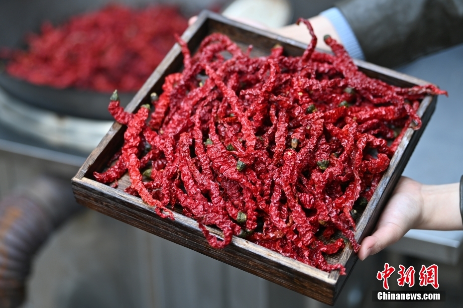 油泼辣子看起来辣,吃起来香,“以香为主、辣中带香、香里泛辣”为特点的甘谷辣椒是不二选择。而当地花椒则以其独特的麻味和香气,为麻辣烫增色添味,丰富口感。图为3月17日,在甘肃省天水市甘谷县一传统辣椒加工企业内,工作人员展示炒制好的辣椒。