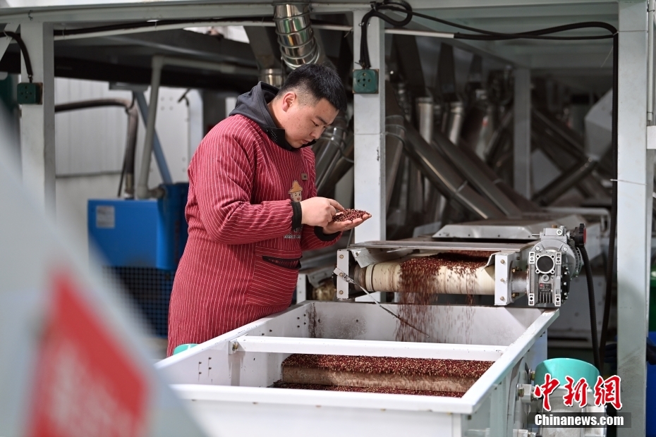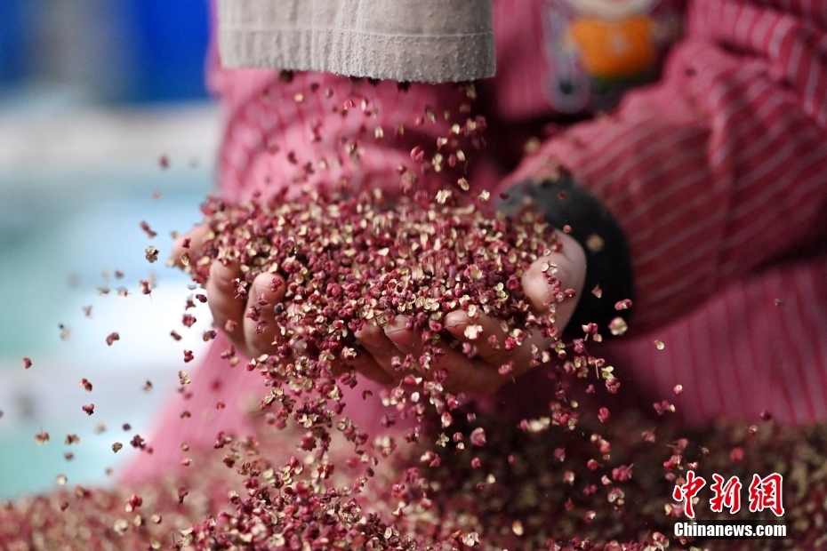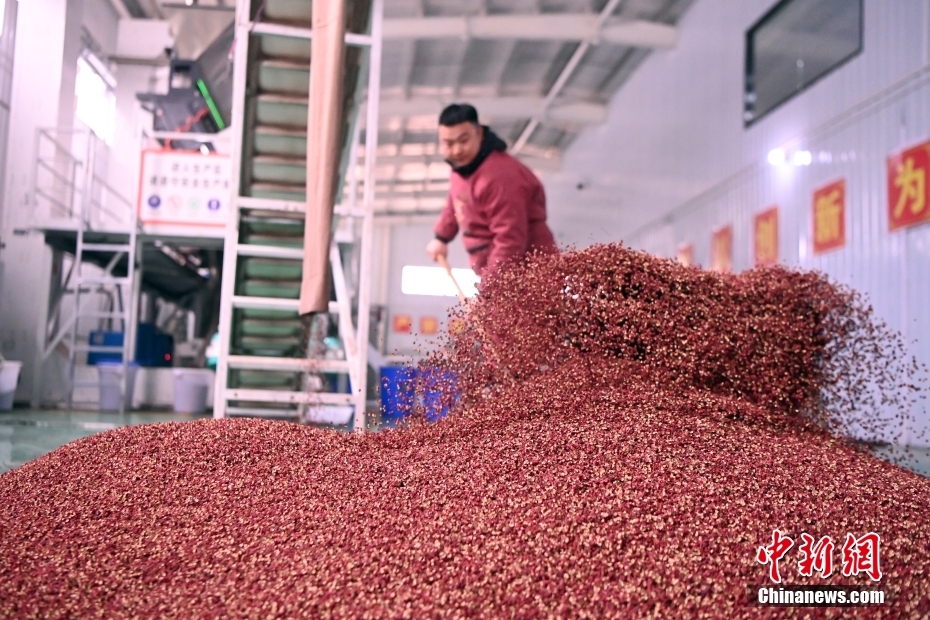 3月17日,在甘肃省天水市甘谷县一花椒加工企业内,工作人员在检查初筛的花椒。