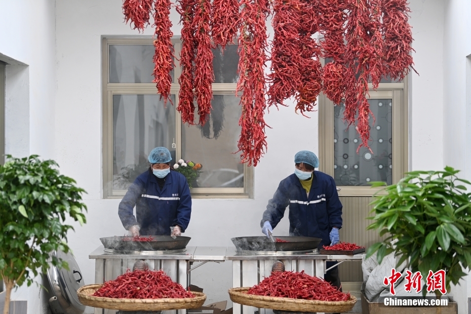 3月17日,在甘肃省天水市甘谷县一传统辣椒加工企业内,工作人员在炒制辣椒。