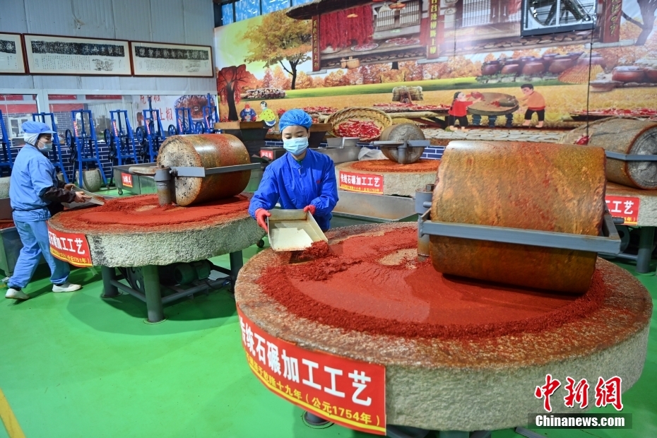 3月17日,在甘肃省天水市甘谷县一传统辣椒加工企业内,工作人员用石臼制作辣椒面。