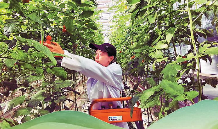 在肃州区东洞戈壁农业园区的智能联栋温室内,工作人员在采摘车上工作。经济日报-中国经济网记者 陈发明摄