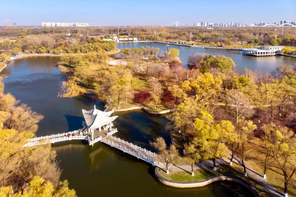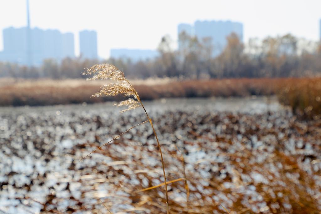立冬时节,登上哈尔滨松浦大桥,在下桥口顺台阶而下,映入眼帘的是大片金黄色的芦苇荡,白色芦花点缀其中迎风招展,透过澄澈的水面依稀可见水草和水藻。在位于哈尔滨市松花江北面的阿勒锦岛国家湿地公园,不少市民来这里徒步、骑行、健身,公园每年接待游客量超40万人次。