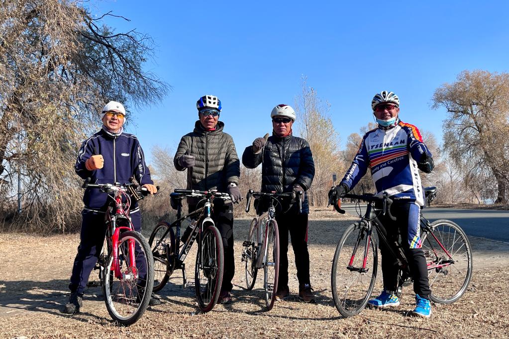 李兴才(左二)与骑友们。新华社记者杨思琪 摄